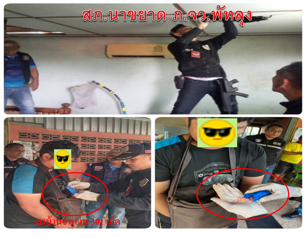 รวมยาบ้าของกลางรายการที่ 1, 2, 3 จำนวน 301 เม็ด พบซุกซ่อนอยู่ในกระเป๋าสะพายหนังสีน้ำตาลแบบมีซิปรูดเปิด-ปิด ขนาด 24X25 ซม. ซึ่งผู้ถูกจับสะพายติดอยู่ที่ตัวขณะยืนอยู่บริเวณหลังบ้านที่เกิดเหตุ