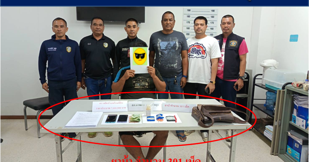 รวมยาบ้าของกลางรายการที่ 1, 2, 3 จำนวน 301 เม็ด พบซุกซ่อนอยู่ในกระเป๋าสะพายหนังสีน้ำตาลแบบมีซิปรูดเปิด-ปิด ขนาด 24X25 ซม. ซึ่งผู้ถูกจับสะพายติดอยู่ที่ตัวขณะยืนอยู่บริเวณหลังบ้านที่เกิดเหตุ