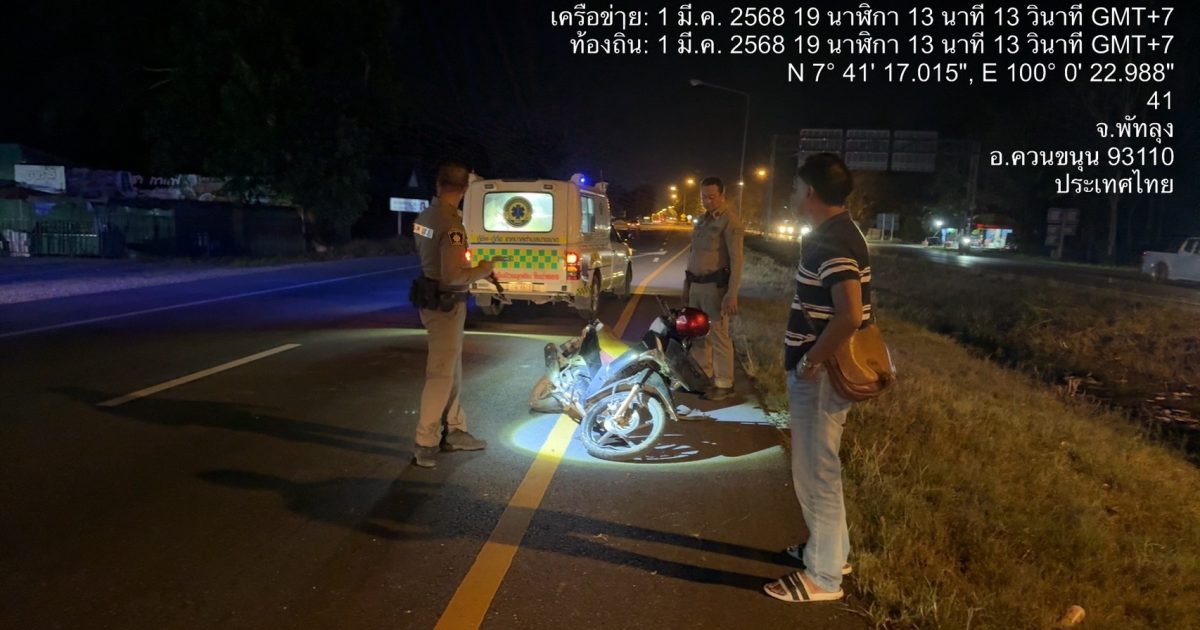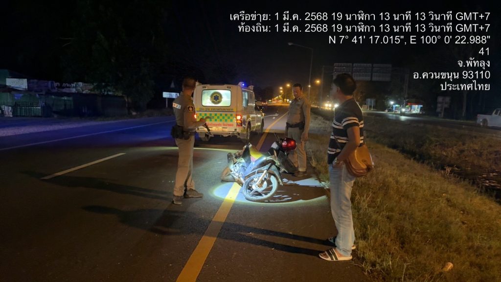 วันนี้ 1 มีนาคม 2568 เวลา 18.45 น. งานจราจร ร้อยเวร20 ชป.รถยนต์ว.4 และพนักงานสอบสวน ร่วมร่วมปฏิบัติหน้าที่เหตุรถ จยย.ชนเสาไฟส่องสว่าง มีผู้ได้รับบาดเจ็บ กู้ชืพนำส่ง รพ.ควนขนุนสถานที่เกิดเหตุ ถนน เพชรเกษม ฝั่งขาล่อง บริเวณใต้สะพานลอย ม.3 ต้น.พนมวังก์ อ.ควนขนุน จ.พัทลุง 6 มีนาคม 2025 โดย admin / ข่าวประชาสัมพันธ์,ผลการปฏิบัติงานของสายงานจราจร,ผลการปฏิบัติงานของสายงานป้องกันปราบปราม,ผลการปฏิบัติงานของสายงานสอบสวน